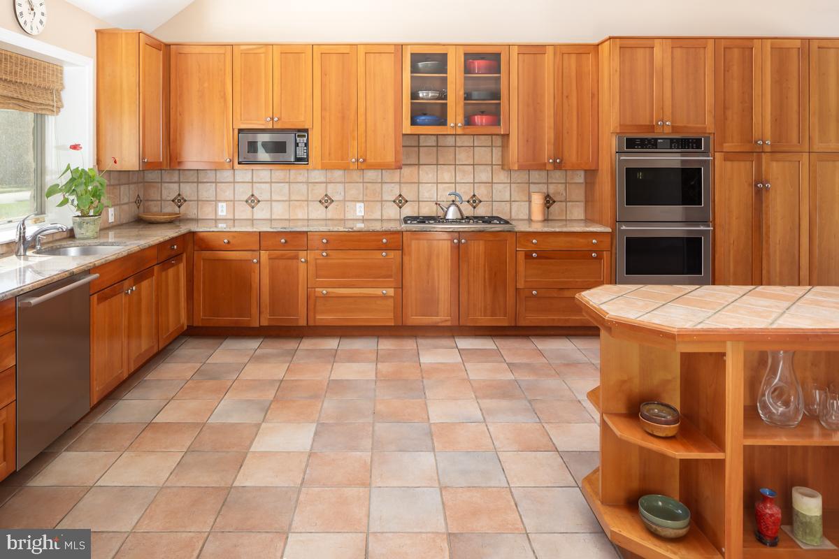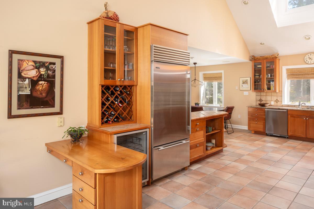 Entertain in style in the formal dining room, adorned with chair moldings and enhanced by French doors leading to the patio. This room offers direct access to the kitchen, facilitating seamless hosting experiences, while the hardwood floors add warmth and sophistication to the ambiance. The chef's kitchen is a culinary haven, boasting tile flooring, solid wood cabinets, stainless steel appliances, granite countertops, double wall ovens, 5 burner stove, built-in wine storage, and a wine fridge. Vaulted ceilings with skylights infuse the space with natural light, while sliding glass doors lead out onto the patio, seamlessly connecting indoor and outdoor living. The adjoining breakfast room provides a cozy spot to enjoy morning coffee or casual meals. Convenience is key with two powder rooms located across the first floor as well as access to the laundry room and two-car garage.