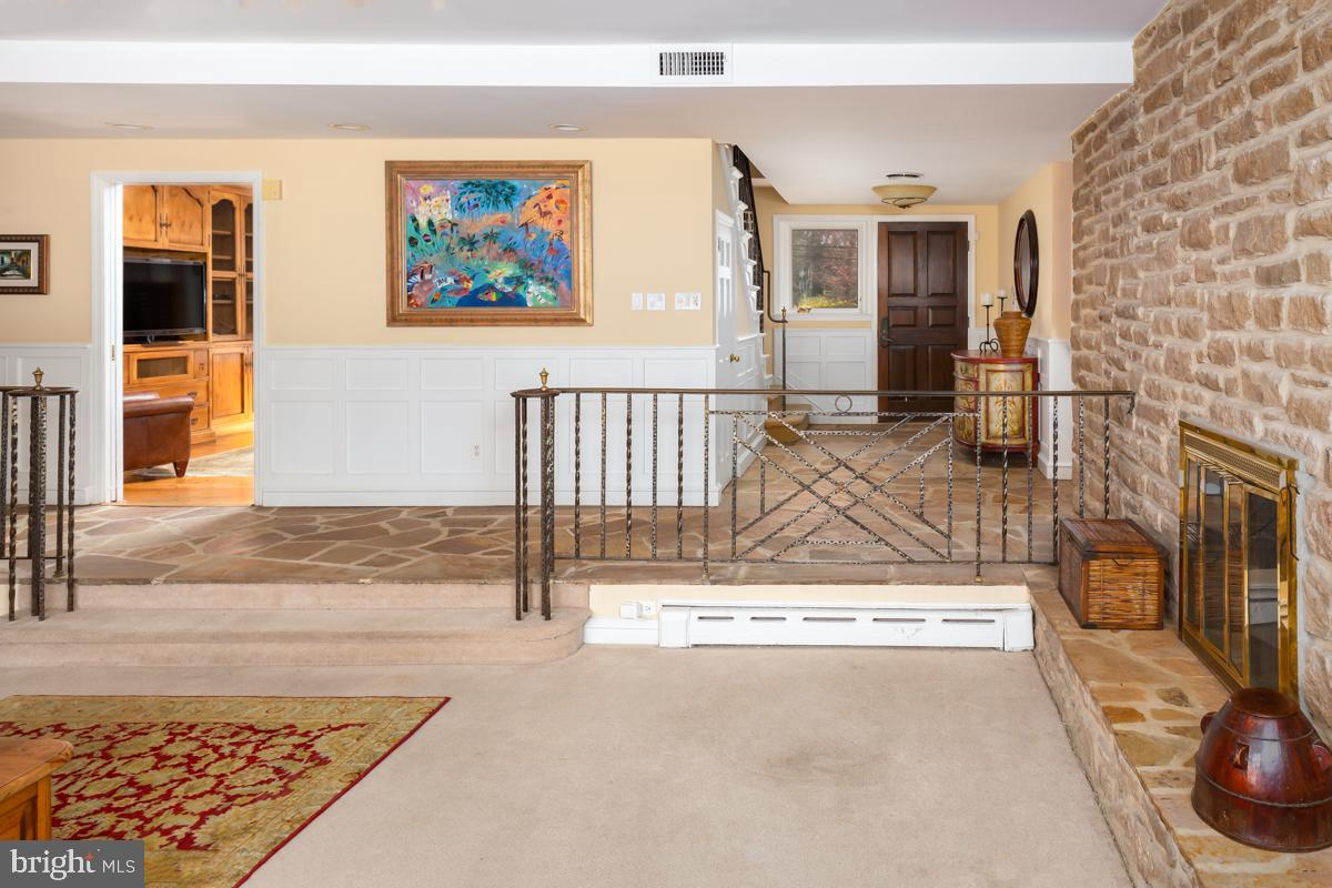 As you step through the inviting entry, you are greeted by the timeless allure of stone flooring and wainscotting, complemented by a convenient coat closet. The sunken living room beckons with plush carpet flooring, a cozy gas fireplace set along a stone wall, and a bay window inviting natural light to dance across the space. Adjacent, the sitting room features gleaming hardwood floors, a wall of built-ins for displaying treasured mementos, an oversized window with a deep sill perfect for lounging, and elegant picture and crown moldings.