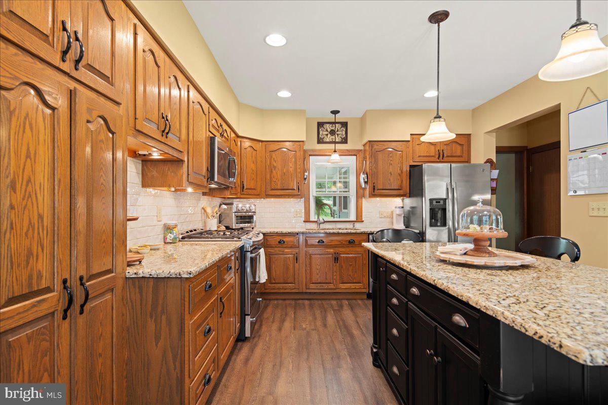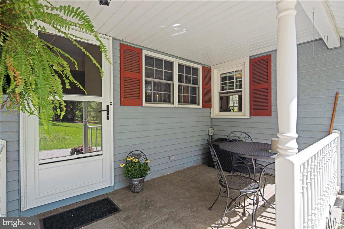 Heading inside, you'll be welcomed by a gorgeous wood burning fireplace and charming bay window, bringing in lots of natural light. An open dining room with sunlit window nook leads into the stylish eat-in kitchen, which features an abundance of wooden cabinets (REAL wood), granite countertops, stainless-steel appliances, a large gas range, and the custom-made center island provides additional storage and seating. Sliding glass doors off the kitchen lead you onto your impressive stone terrace with another built-in fireplace, ideal for entertaining or just a cozy night under the stars! The elegant stone walkway from the terrace brings you around back to your beautiful, covered porch - another peaceful place to relax after a long day! The hallway off the kitchen features a sunny laundry room (with a laundry shoot!), a spacious mudroom and a half-bath. Upstairs, there are three bedrooms with all-day natural light, one even has a private covered balcony! There are two full baths, one with a jacuzzi tub, skylight and carpeted sitting room with granite-topped vanity and plenty of cabinets for linens and towels. There is an attic full of natural light that provides plenty of additional storage space, and an unfinished but dry basement for more storage overflow, which includes a huge freezer.